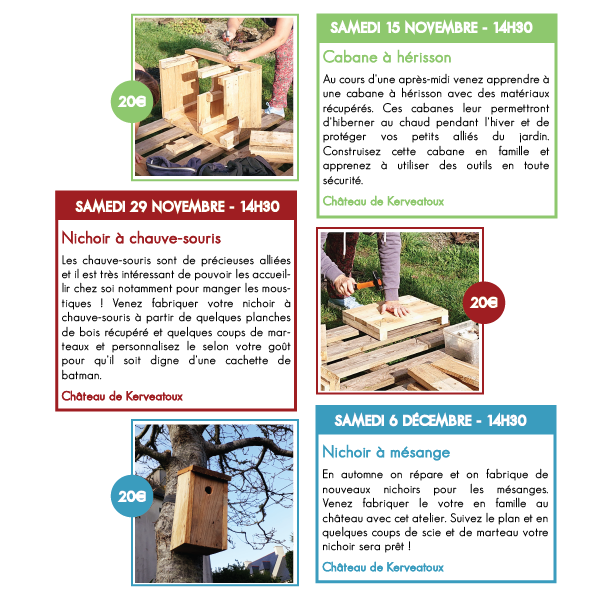 Pour les ateliers constructions de nichoirs et cabanes : inscriptions au 06 10 80 75 20 ou atelier-ecolau@gozmail.bzh